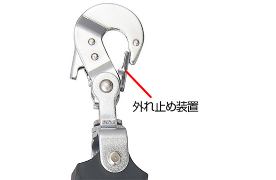 この状態で墜落すると着脱フックの外れ止め装置に横方向の負荷が掛かり、ハーネス背中D環からランヤードが外れる危険性があります。