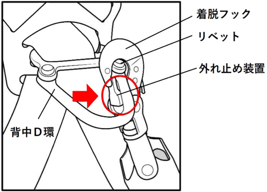 2社共同での原因調査の結果、下図のように藤井電工社製フルハーネスの背中D環リベットに、TJMデザイン社製ランヤードの着脱フックが掛かることがあり、