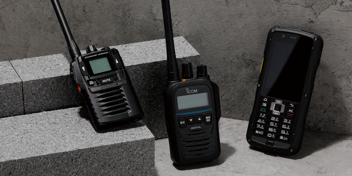 ミドリ安全では、資格が不要で導入が容易な近~中距離タイプの特定小電力無線機、遠距離タイプのデジタル簡易無線機(免許局、登録局)、広域タイプのMCA無線機をご用意しています。また、その他、「衛星電話」や災害時にも安定して使える通信手段としてオススメする「IP無線機」もラインナップ。